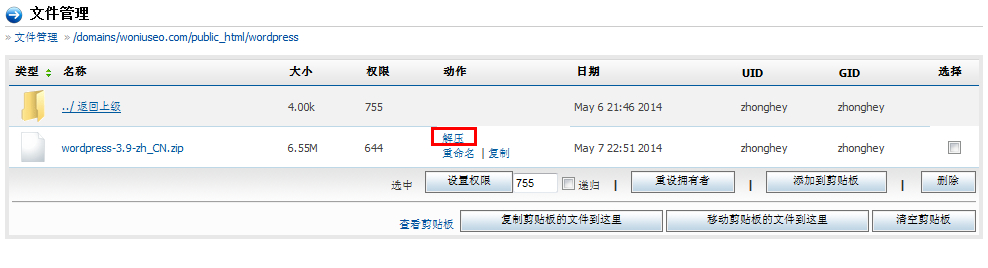 4. 這時我們可以把Wordpress下面的wordpress-3.9-zh_CN.zip文件刪除,并把wordpress的空目錄刪除。