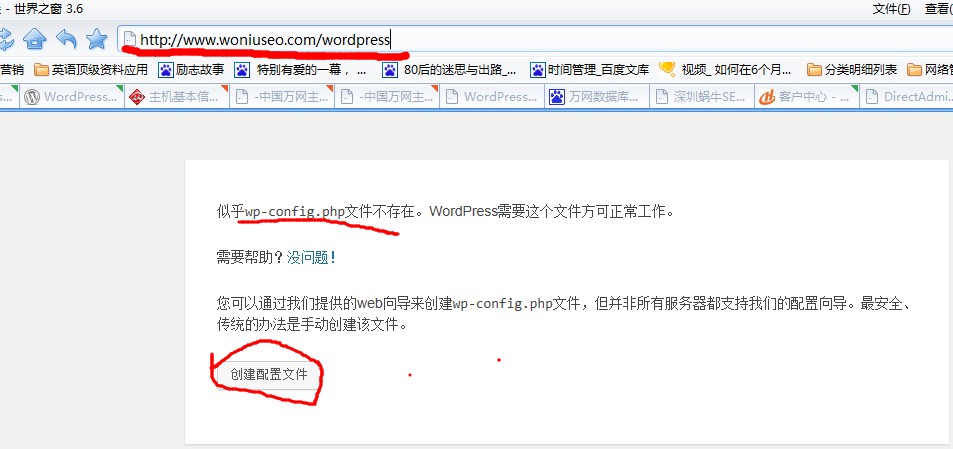系統榕提示,似乎Wp-config.php文件不存在,需要有這個文件才能工作。這是網站的配置文件,所以不存在我們就得創建它。點擊:創建配置文件。