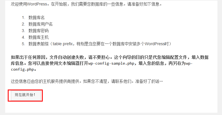 - 提示我們需要數據庫信息,點擊下面的“現在就開始!”