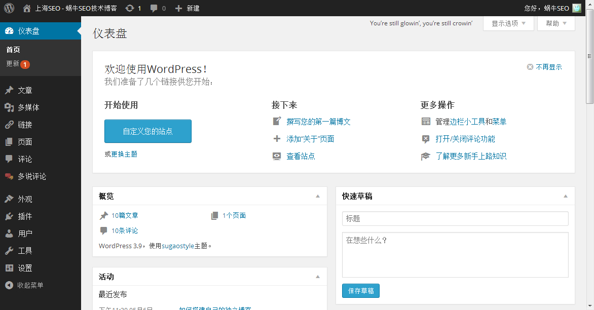 WP的后臺就是這樣的。后臺儀表盤默認由:首頁,文章,多媒體,鏈接,頁面,評論,外觀,插件,用戶,工具,設置十一項構成。(首頁下面的更新是WP的更新提示,無法隱藏,如果想要更新,可以進行更新操作。另第三方有隱藏更新提示的相關方法)