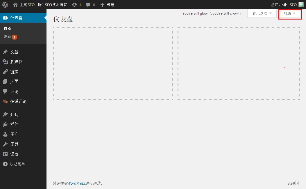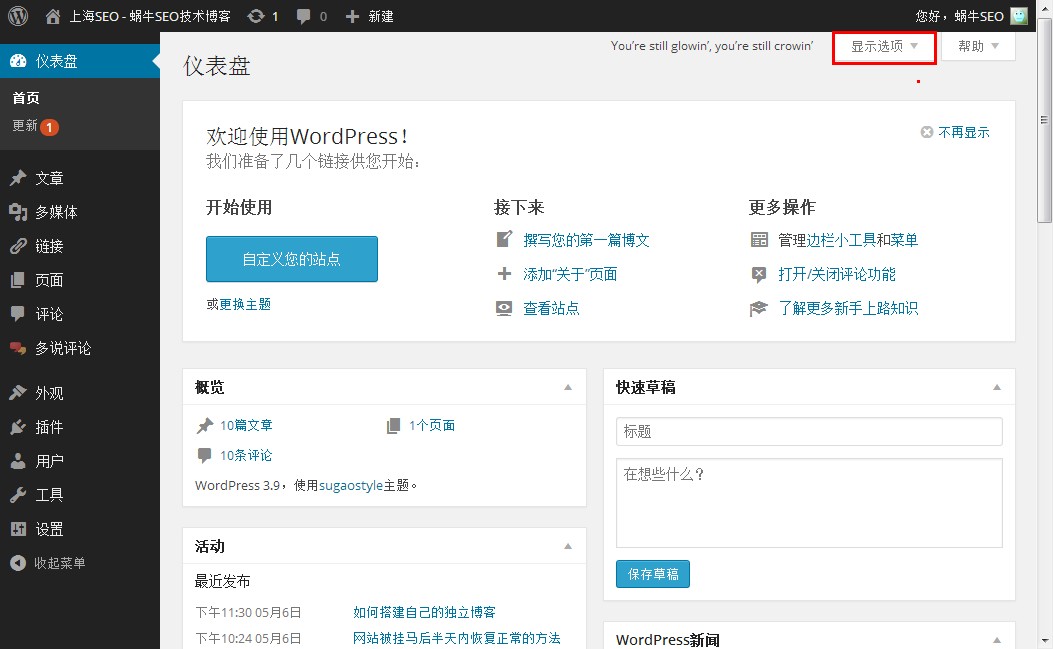 可以在后臺首頁“顯示選項”選擇你想要在后臺顯示和不想要顯示的項目。如下圖,把所有項目都隱藏掉,后臺首頁就變得空蕩蕩得了。相信有些朋友用過幾個月甚至幾年都不知道有這功能吧。右邊還有個“幫助”呢。幫助,是什么內容,建議大家最好去看看,蝸牛就不在這里細說了。