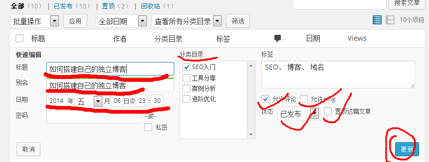 點擊文章下面的“快速編輯”,可以修改標題,文章別名,發布日期,加密或設為私密,修改分類目錄,修改標簽,是否允許評論,是否允許ping,發布狀態,是否置頂。(嘿嘿,是不是激動了,是不是很多東西,你都沒有用過,都不知道呢,是不是好奇怪別人的博客怎么就能置頂了呢,自己的怎么就不能了呢?別瞎想了,蝸牛花那么多時間深更半夜寫那么多內容,就是讓你瞎想的嗎?趕快實際操作吧,趕快往下看吧,別浪費時間了。)
