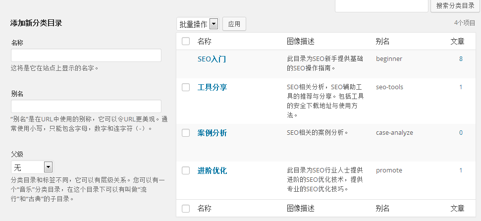 是添加到你菜單上面的分類,名稱就是顯示名。別名是用來顯示在網址上面的,如果是中文,顯示出來會是亂碼,建議用拼音或是英文。描述,就說一下你這個目錄里面是用來放什么東東的就可以了。