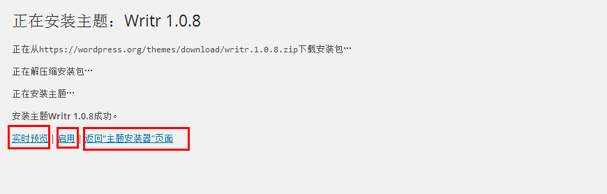 在主題界面,我們點擊頂部的“添加”,即可“上傳主題”。或者從Wordpress官方提供的一些主題中通過不同的條件,選擇出我們喜歡的主題,點擊“預覽”或“安裝”即可預覽或安裝主題。安裝成功主題之后,會提示如下圖“正在解壓,安裝主題,主題安裝成功。
